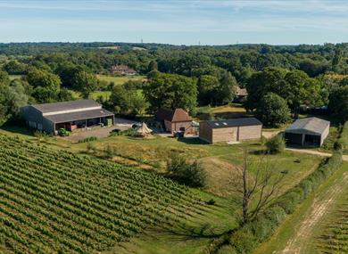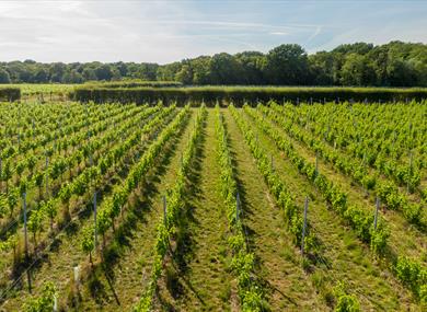 The vineyard is 17 meters above sea level and six miles from the English Channel and from a south-west slope stretches out towards a wood with giant oak trees, creating a warm and protected microclimate. Pinot Noir, Pinot Meunier, Chardonnay and Seyval Blanc vines produce award-winning English still and sparkling wines.
