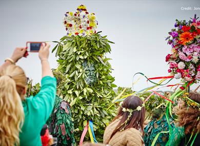 At the heart of the celebrations is Jack - a Jack-in-the-Green: a figure completely cloaked in foliage and crowned with flowers. Jack bursts onto the streets of Hastings, leading a joyful procession through the town. After a day of revelry, Jack is ceremonially stripped of leaves to release the spirit of summer. Catching a leaf is said to bring a year of good luck.