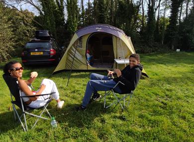 Our pitches vary in size and include enough space for your tent, trailer tent, touring caravan or motorhome, plus a car, gazebo or awning. Our hardstanding pitches are composed of a gravel/concrete plot for your tourer and a surrounding area of grass for your awning. Camping guests are welcome to pitch up in the tent field at the top area in the touring field.